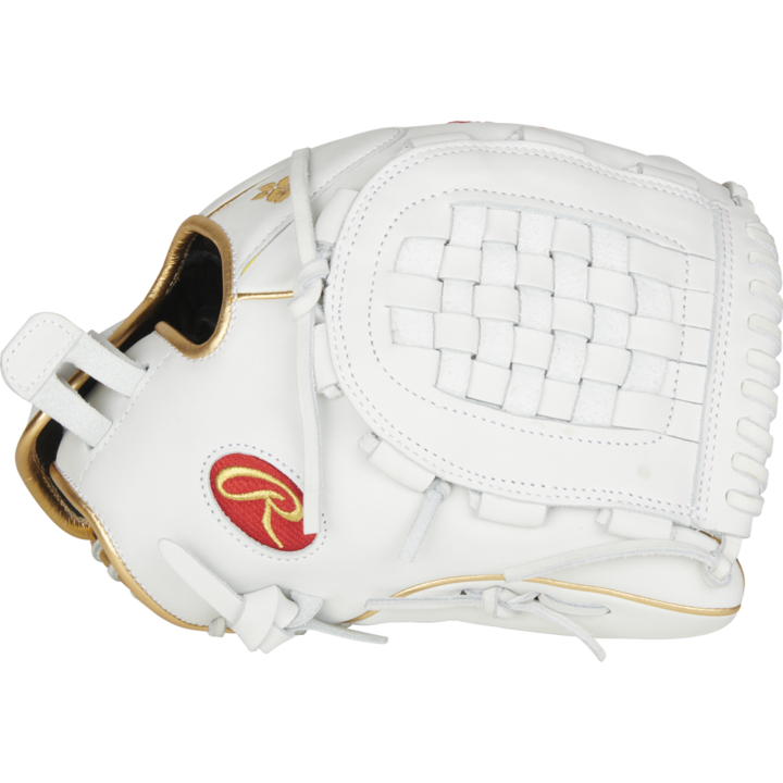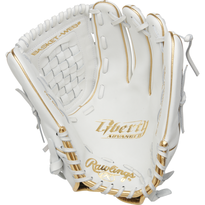 The new Rawlings Liberty Advanced 12.5 inch white fastpitch glove RLA125KRG is latest edition to the Rawlings Liberty series. This new Keilani Ricketts glove takes the previous all white design and enhances it with some gold welting. We thought the glove helped you stand out with the previous edition. Now the Rawlings Liberty Advanced 12.5 inch white fastpitch glove RLA125KRG provides a look that is both flashy and elegant. The end result is an updated pro style look and comfort, with a vigorous shell leather determining admirable shape retention and an unmatched production level. This glove uses Tennessee Tanning rawhide leather laces. Those laces make this mitt durable and high performing. These Rawlings Liberty gloves have patterns specifically designed for top level softball players.